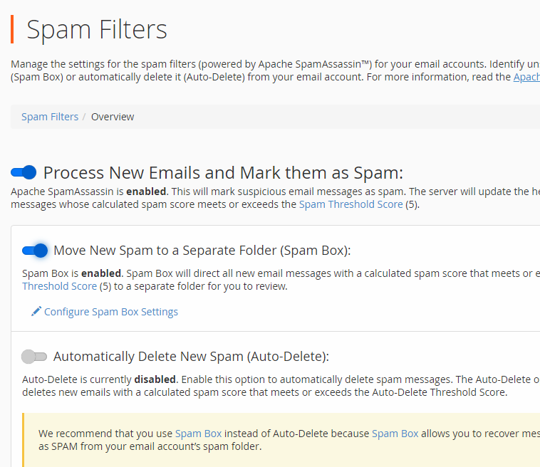 Dans Spam Filters, nous allons activer l'option Move New Spam to a Separate Folder (Spam Box)